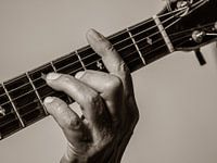 Een hand op de brug van de gitaar van een muzikant.