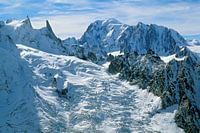Au coeur du massif du Mont-Blanc se succèdent galciers et sommets. Sur cette photographie aérienne le glacier du Mont-Mallet, les Périades, la Dent du Géant et le Mont-Blanc.