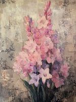 Gladiolen | Gladiolen Pracht - Dit is een bloemenschilderij dat levendige en rijkelijk gekleurde gladiolen uitbeeldt tegen een rustieke, vervaagde achtergrond met subtiele hints van bloemenpatronen.