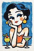 Glamorous Sip - Dit vrouw schilderij toont een elegante vrouw met opvallende gele oorbellen, die leunt op haar hand terwijl ze geniet van kleurrijke cocktails in een feestelijke setting met een levendige blauwe achtergrond.