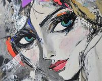 Details: vrouw schilderij, gezicht schilderij, moderne kunst, abstract, groen, zwart, rood, blauw, grijs, oranje