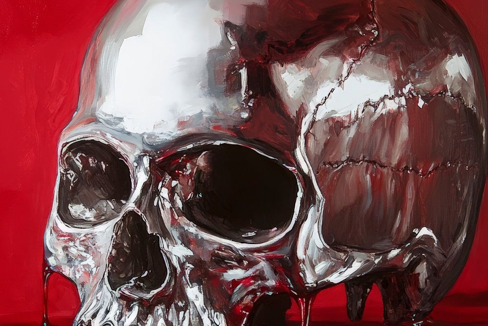 Een fascinerend spel van licht en schaduw ontvouwt zich hier: een glanzende schedel sculptuur omgeven door een gloeiende, bloedkleurige achtergrond. De koele elegantie van de schedel contrasteert met de onheilspellende kleuren, waardoor dramatische accenten ontstaan. Ideaal voor een woonkamer of galerie waar het zal aanzetten tot nadenken en een gesprek.