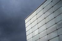 Moderne glasstructuren en donderwolken zorgen voor een mooi kleurenspel in Katowice, Polen