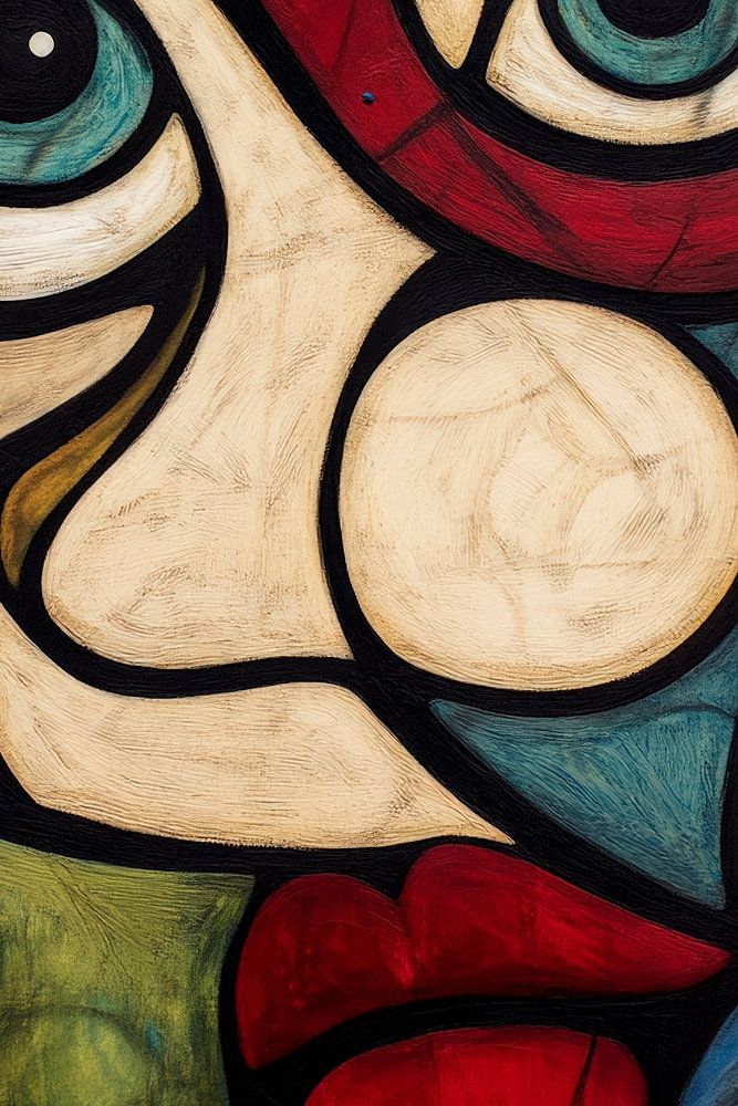 Een fascinerende compositie van gebogen lijnen en levendige kleuren wekt de indruk van een diepe aanwezigheid. De grote, expressieve ogen boeien de kijker, terwijl het harmonieuze kleurenpalet een spannende sfeer creëert. Ideaal voor een creatieve woonkamer die inspirerende gesprekken stimuleert.