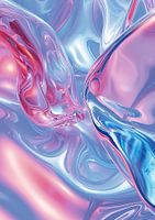 Een schilderij met een glanzend holografisch patroon in blauwe, roze en paarse tinten, geïnspireerd op de vloeiende, glasachtige vormen van organische sculpturen.