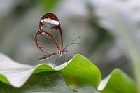Glasvleugel vlinder (Greta oto) op een blad. Bokeh achtergrond. Vlinder met doorzichtige vleugels op een blad. Tropische vlinder in de zomer.