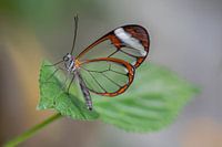 Glasvleugel vlinder (Greta oto) op een blad. Bokeh achtergrond. Vlinder met doorzichtige vleugels op een blad. Tropische vlinder in de zomer.