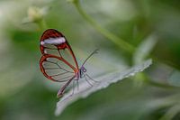 Glasvleugel vlinder (Greta oto) op een blad. Bokeh achtergrond. Vlinder met doorzichtige vleugels op een blad. Tropische vlinder in de zomer.