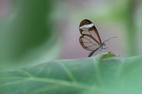 Glasvleugel vlinder (Greta oto) op een blad. Bokeh achtergrond. Vlinder met doorzichtige vleugels op een blad. Tropische vlinder in de zomer.