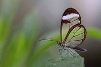 Glasvleugel vlinder (Greta oto) op een blad. Bokeh achtergrond. Vlinder met doorzichtige vleugels op een blad. Tropische vlinder in de zomer.