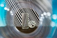Studiofoto van glaswerk tegen een schuin gestreepte zwart-wit achtergrond gemaakt door een transparante buis die zorgt voor lichtpuntjes.