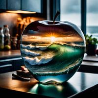 Na bewerking AI creatie van een glazen appel op een tafel in de keuken met de reflectie van zeegolven en zonsondergang als illustratieve en abstracte fotokunst