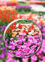 Kristallen bal met verschillende tulpen in bloemenveld in Keukenhof, Nederland. Bloeiende bloemen in lente seizoen, met felle kleuren zoals: roze, rood, zalm en wit.