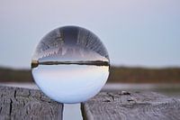 Glazen bol op een loopbrug die uitmondt in een meer in Zweden. Stilleven in Scandinavische natuur
