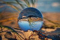 Glazen bol op het strand van Zingst. Het duingras wordt weerspiegeld in de bol. Zomer, zon, strand, zand, schelpen, veren en vakantie.