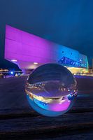 Nachtopname van een glazen bol voor de Phaeno in Wolfsburg met speciale verlichting