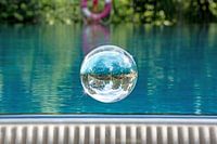 Glazen bol zweeft boven een zwembad met een spiegelende bewolkte lucht en bomen