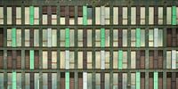 Foto van een moderne glazen gevel in Berlijn, Duitsland. Ik heb alleen een beetje digitale nabewerking gedaan op deze opname van de vele kleine ramen van een kantoorgebouw in Berlijn Friedrichshain.