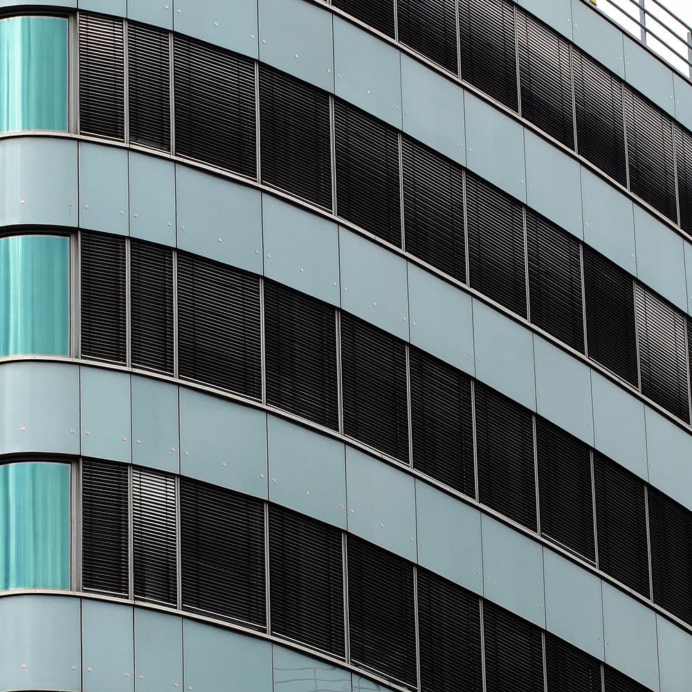 Foto van een moderne glazen gevel in Berlijn, Duitsland. De opname van de vele ramen van het gebouw is door mij slechts licht nabewerkt.