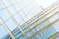 Omhoog kijkend naar de architectonisch moderne glazen gevel van het kantoor- en bedrijfsgebouw Kranzler Eck met zijn moderne combinatie van glas en metaal midden in het hectische centrum van Berlijn in de wijk Charlottenburg.