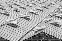 Lijnenspel van de daken va de kassen in het Westland (glazenstad) foto in zwartwit