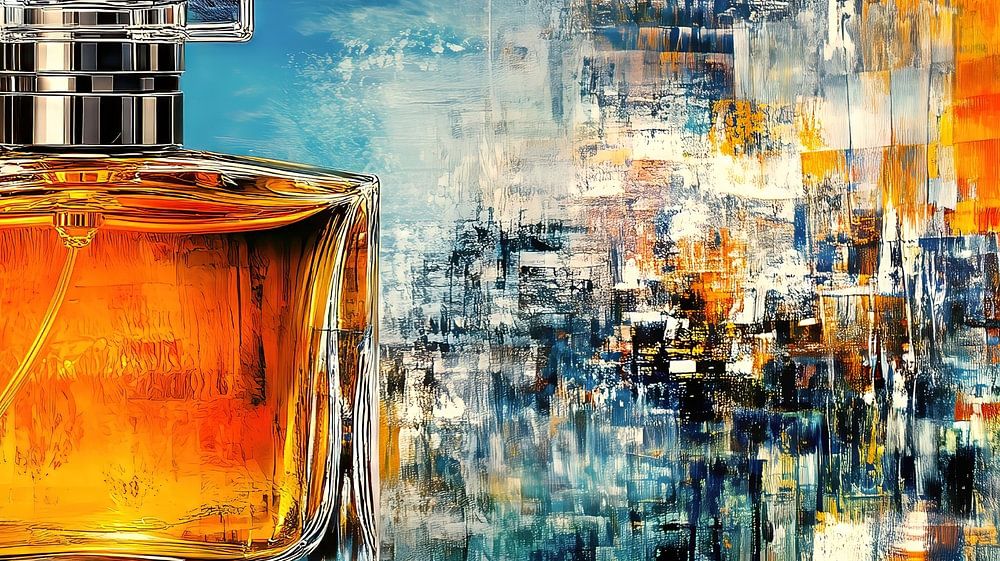 Een elegante glazen fles met gouden parfum staat op een reflecterend oppervlak. Op de achtergrond creëert een abstract, kleurrijk stadsbeeld een moderne en luxueuze sfeer. De afbeelding belichaamt de wereld van cosmetica, schoonheid en elegantie.