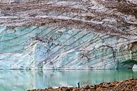 Prachtig detail van het ijs op de gletsjer van Mount Edith Cavell in Jasper National Park - Canada. Mooi lijnenspel in het blauwe ijs en spiegeling in het water. Met een eenzame wandelaar op de voorgrond. Geeft mooi de verhoudingen weer.