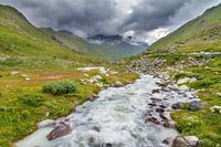 Prachtige landschap opname van de Moiry rivier vanaf de gletsjer naar meer Lac de Moiry in de Zwitserse Alpen nabij Grimentz in de Val d'Anniviers vallei in het kanton Wallis in Zwitserland in de zomer met dreigende lucht