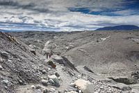 Wandelaars lopen op een gletsjer die bedolven is onder steengruis wat inde loop der jaren erover heen is gekomen. De verhouding mens natuur is hier goed te zien.