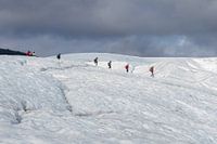 Een wandeling over het gletsjerijs van de Root gletsjer in Alaska. Mensen lopen met speciale overschoenen op het oude ijs.