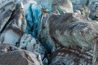 Gletsjerijs IJsland met de blauwe kleur van het ijs en het zwart van het vulkanische as.