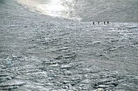Vier bergbeklimmers komen terug van hun hooggebergte en lopen over de gletsjer.