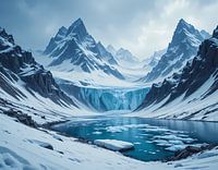Een adembenemend uitzicht op een gletsjervallei, waar torenhoge besneeuwde bergen een sereen turquoise meer omarmen dat bezaaid is met ijsschotsen. Een enorme gletsjer daalt af van de toppen, zijn ijsblauwe tinten steken af tegen het grimmige witte landschap. De scène roept een gevoel van vrede en de rauwe kracht van de natuur op.