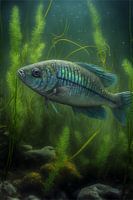 Dompel jezelf onder in deze serene onderwaterwereld waarin een levendige vis moeiteloos door een weelderig waterwoud glijdt. De weelderige groene planten wiegen zachtjes terwijl de stralen van het gefilterde licht de glinsterende, iriserende schubben van de vis verlichten. Deze vredige compositie vangt de stille schoonheid van het leven…