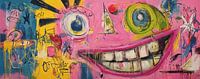 Glimlach Kunst - Dit is een abstract schilderij met een grote, vrolijke glimlach en heldere kleuren zoals roze en geel, waarbij er ook diverse levendige vormen en lijnen doorheen lopen die een speelse sfeer creëren.
