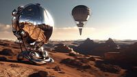 Deze afbeelding toont een buitenaards landschap in tinten van bruin, oranje en blauw, waarin enkele glimmende robots zich bevinden. Het lijkt alsof deze robots de enige bewoners van deze vreemde planeet zijn en ze zijn volledig op hun taak gefocust. Hun glanzende metalen oppervlakken reflecteren het licht van de planeet en doen denken aan een futuristische esthetiek. Je kunt je afvragen wat deze robots hier precies doen en waarom ze zo belangrijk zijn voor deze planeet? De afbeelding nodigt uit tot verbeelding en fantasie en doet ons nadenken over wat er allemaal mogelijk is in het onbekende universum.