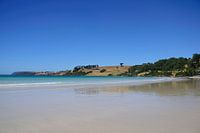 Genieten op het strand bij het stadje Boat Harbour Beach in de staat Tasmanië, Australië. Volgens de reisgids was dit het beste strand ter wereld en hoewel het er heel mooi uitzag, was het dat zeker niet. Ik hield wel van het glinsterende zand toen het water zich terugtrok.