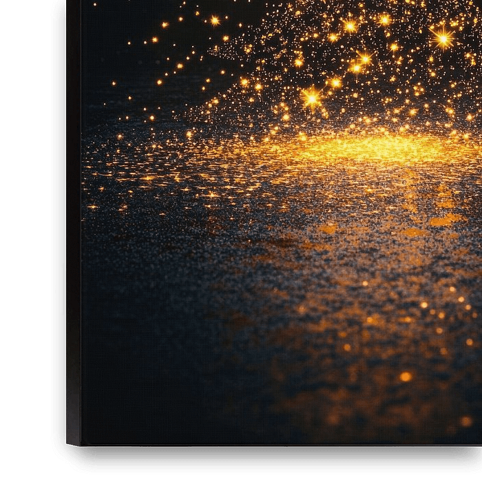 Een glinsterende kerstboom ontwaakt in gouden licht en straalt feestelijke magie uit. De fonkelende sterren en glinsterende gloed creëren een warme sfeer die herinneringen oproept aan de feestdagen. Dit kunstwerk is ideaal om een verwelkomend tintje aan je woonkamer te geven en brengt vreugde in elke kamer.
