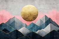 Abstracte bergen met een gouden zon in een roze lucht, een eenvoudige illustratie in een plat ontwerp, vectorkunst met een gestructureerde, handgetekende look, tegen een achtergrond van gestructureerd papier met structuurverf, accenten van goudfolie en een structuurkorrel voor een vintage gevoel. Het kleurenpalet bestaat uit gedempte…