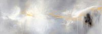 Een fascinerend spel van mist en licht ontvouwt zich in zachte grijstinten, afgewisseld met gouden accenten. De subtiele transparantie en het vloeiende samenspel van de elementen creëren een dromerige sfeer die de kijker meeneemt naar een andere wereld. Hier dansen vormen in de luchtige ruimte alsof ze net uit een dagdroom zijn ontsnapt.