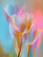 Een dromerige digitale tulp, opgebouwd uit zijdezachte lijnen en lichtgolven. Deze AI-gecreëerde bloem zweeft tussen natuur en algoritme, in een harmonie van pastelblauw, warm oranje en magenta roze. Glitched Grace vangt de fragiele schoonheid van het organische in een futuristische gloed.
