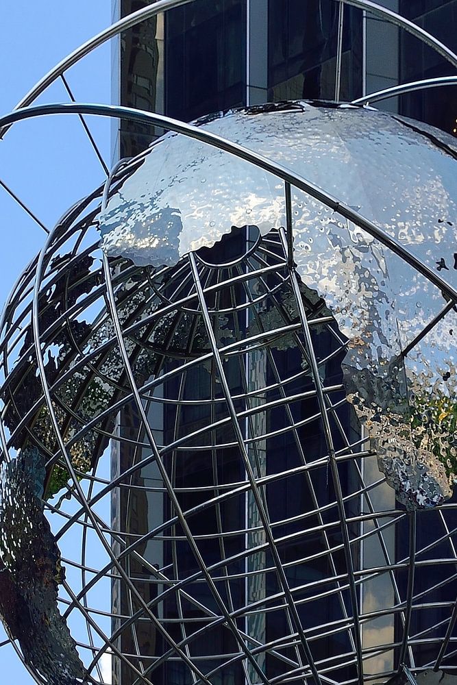 Na een heerlijke wandeling in Central Park zagen we deze wereldbol sculptuur op Columbus Circle in New York, USA. Indrukwekkend kunstwerk.