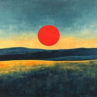 "Gloeiende Lucht" is een opvallende minimalistische weergave van de stille kracht van de natuur. Het schilderij vangt het dramatische contrast tussen een gloeiende rode zon en het donkerende landschap hieronder, tegen een achtergrond van vervagende schemering. De eenvoudige vormen en gedurfde kleuren roepen een gevoel van rust op, maar er is een onderliggende intensiteit die spreekt over de altijd aanwezige krachten van de natuur. Dit kunstwerk trekt de kijker in een moment van stilte, waar de dag de nacht ontmoet in een harmonieuze balans van licht en schaduw.
