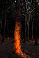 Het lukt de zon nog net om deze boomstam te beschijnen, zodat het in brand lijkt te staan. Doordat de bomen ten zuiden van Cecina tot aan het strand staan heeft de zon tot het laatste moment de gelegenheid haar mooie werk te doen: er staat niets in de weg.