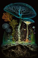 Betreed een magisch bos met deze levendige illustratie van gloeiende paddenstoelen die oplichten tegen een diepe, donkere achtergrond. Omringd door delicate planten en een ingewikkeld netwerk van wortels gloeit elke paddenstoel in rijke tinten oranje, blauw, paars en groen, waardoor een dromerige sfeer ontstaat. De fijne details en…
