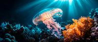 Te midden van zachte lichtstralen zweeft een elegante kwal door een dromerige onderwaterwereld, omringd door lichtgevende koralen. De zachte bewegingen en betoverende gloed geven de kamer een rustgevende sfeer. Ideaal voor de slaapkamer of een ontspannende woonkamer, waar de schoonheid van de oceanen je uitnodigt om tot rust te komen.