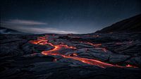 Dit indrukwekkende beeld toont de rauwe, ongetemde kracht van de natuur in de vorm van gloeiende lavarivieren die zich uitstrekken over een vulkaanlandschap. Onder een heldere nachthemel, verlicht door ontelbare sterren, lopen de vuurrode rivieren als gloeiende aderen door het zwarte, afgekoelde gesteente. De contrasten tussen de diepe duisternis van de nacht en het intense rood van de lava creëren een adembenemend landschap.