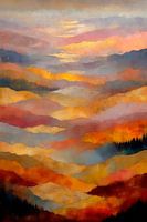 Warme golven van licht rollen als een eindeloze zee over de bergen. Dit werk roept associaties op met mythen van de dageraad – de godin Eos die het licht van de ochtend uitstrooit over de wereld. De zachte overgangen van oranje, rood en goud maken het ideaal voor een slaapkamer of woonkamer waar rust en warmte gewenst zijn.