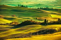 Glooiende heuvels bij zonsondergang in Val d'Orcia. Landelijk landschap in Toscane. Italië, Europa