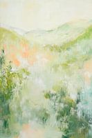 Zachte heuvels glinsteren in zachte groentinten en leiden het oog naar een mysterieuze horizon. Een delicate mist omhult het landschap, terwijl een warme, bijna droomachtige lichtstemming het landschap doordringt. Natuur en emotie smelten hier samen en de kijker wordt uitgenodigd om zich onder te dompelen in deze kalme, harmonieuze wereld.